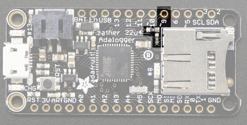 #9 - GPIO #9, also analog input A9 and can do PWM output. This analog input is connected to a voltage divider for the lipoly battery so be aware that this pin naturally 'sits' at around 2VDC due to the resistor divider