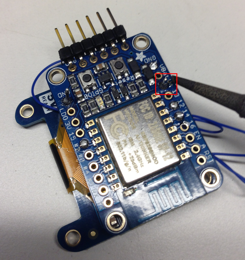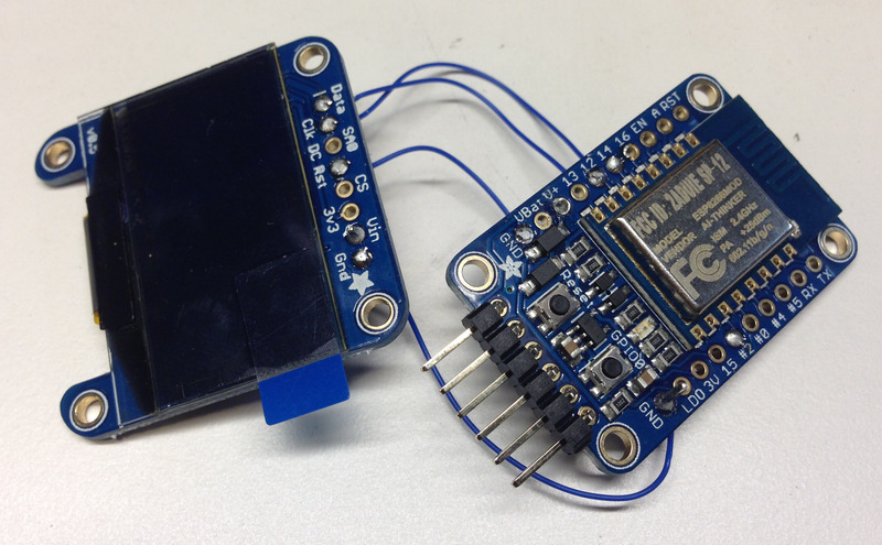 Ultimately you will solder the two boards with a header pin lining up V on the Huzzah and Vin on the 1.3" OLED. This way all the boards will stack up nicely. Make the other wire connections before soldering the two together however, since it will make the process easier. I've found that thin-gauge, wrapping style wire works best.