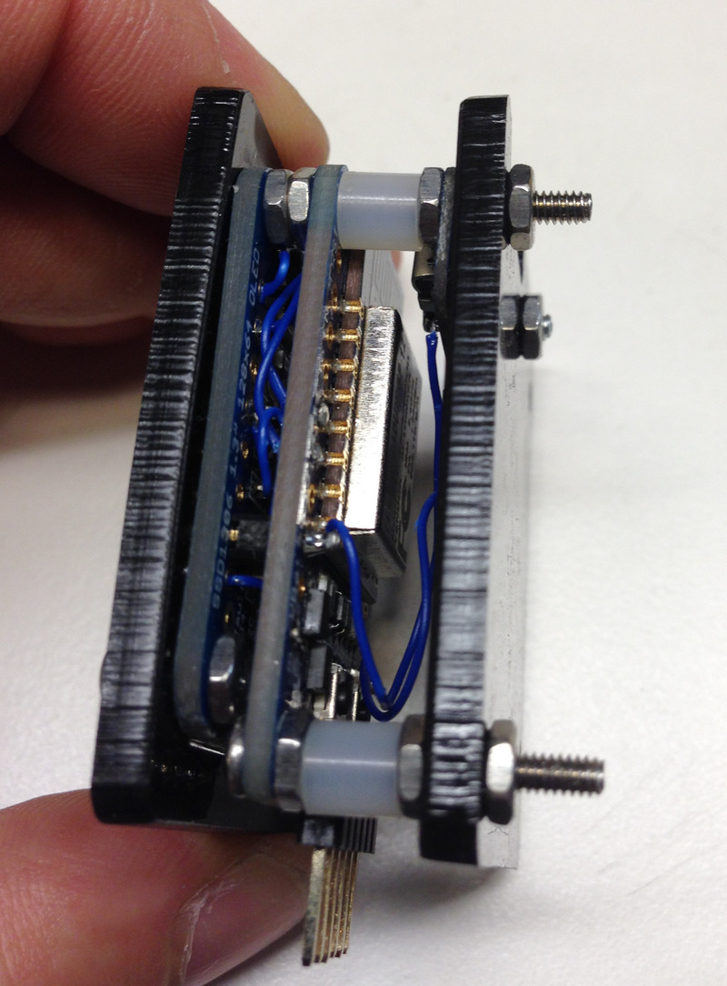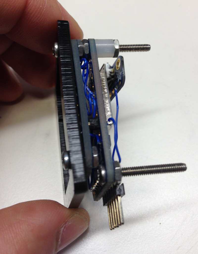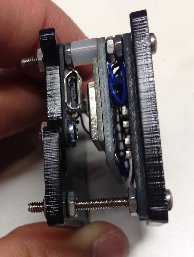 Place the other hole of the microUSB breakout through the 1" screw and secure with a hexnut. You can also secure the other side of the acrylic with a hex nut.