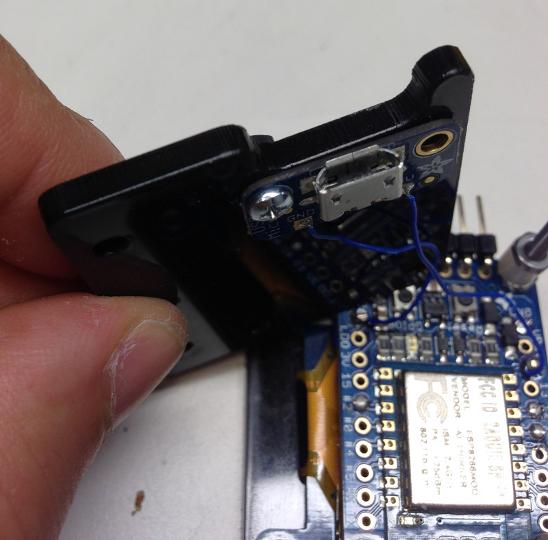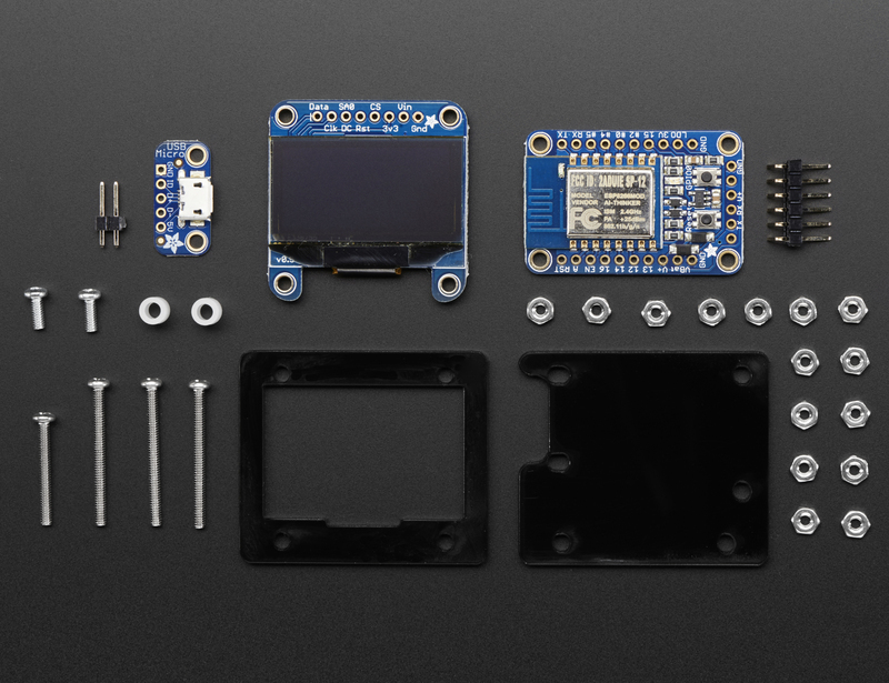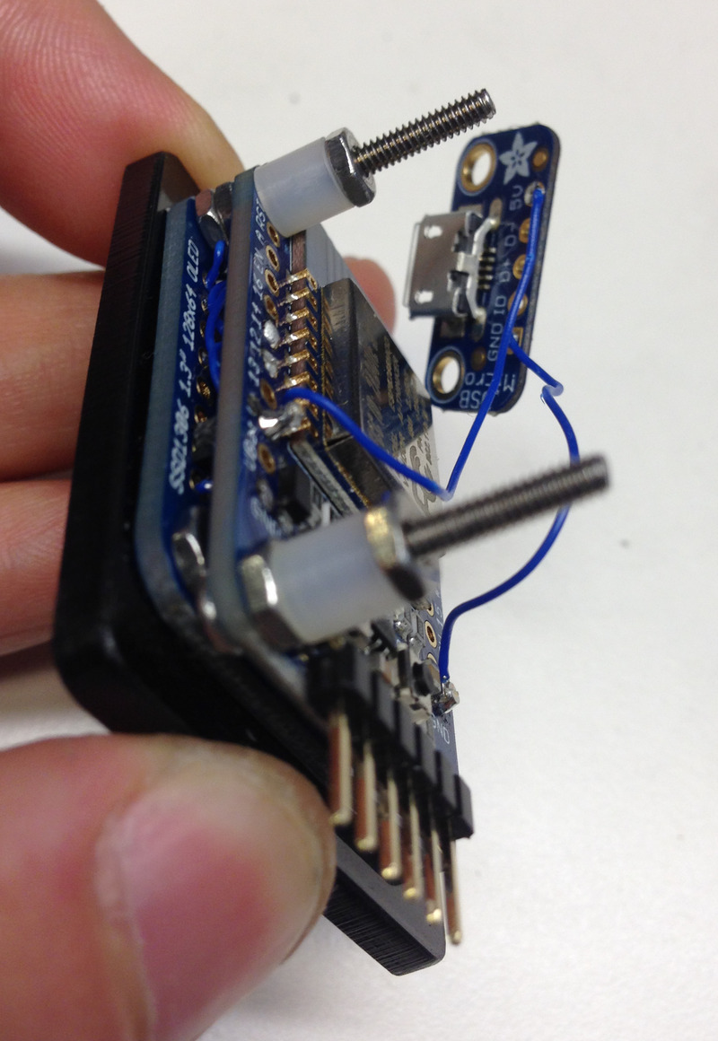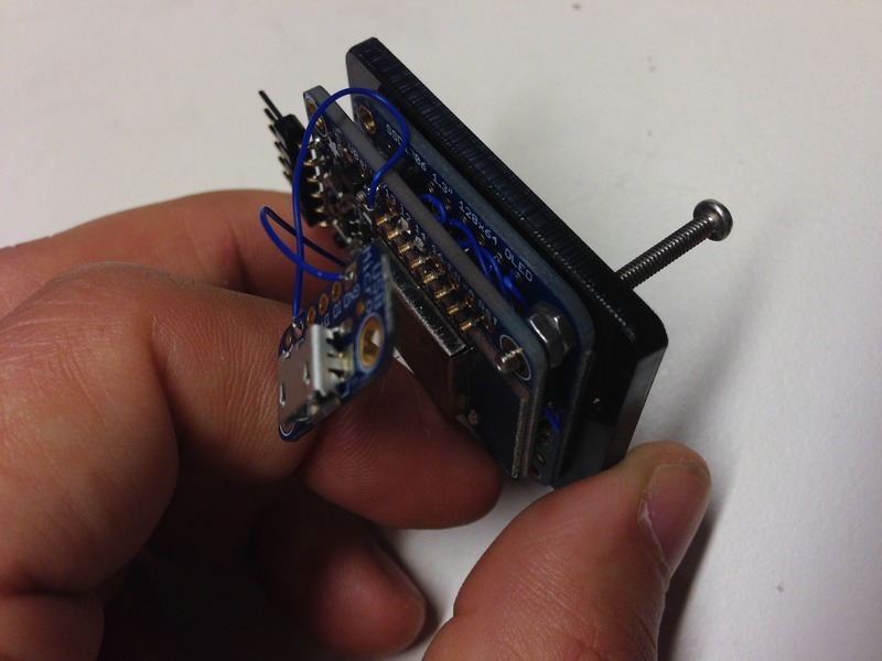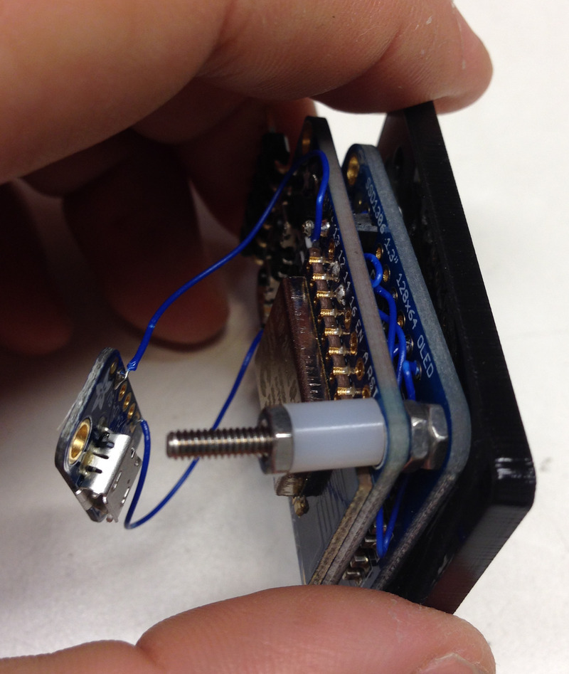 Place the 3/4" screw into the top right hole of the Huzzah breakout. You might need to angle this in to get past the OLED breakout. Tighten down with a hex nut.