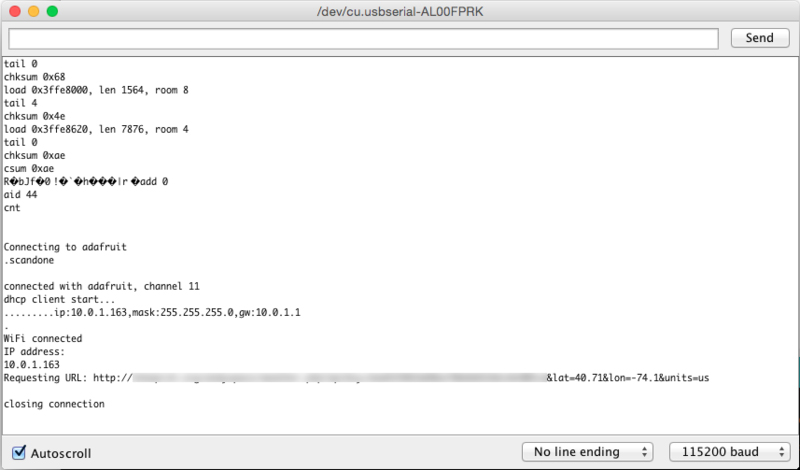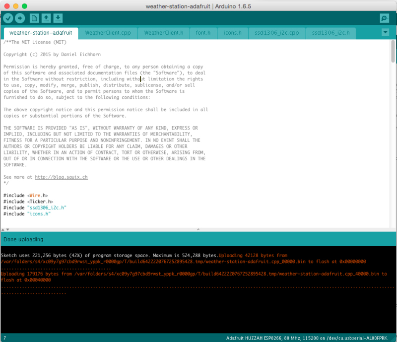 Note on difficulty: this is an intermediate level project and involves running a PHP script on a web server to parse data from forecast.io before it gets read by the Huzzah. It's helpful to know some basics about PHP and web servers before starting this project!
