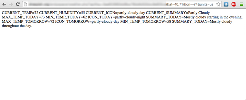 It's a good idea to test the PHP script at this point by pointing your web browser to: http://YOUR_DOMAIN_NAME/weather.php?apiKey=APIKEY&lat=40.71&lon=-74&units=us