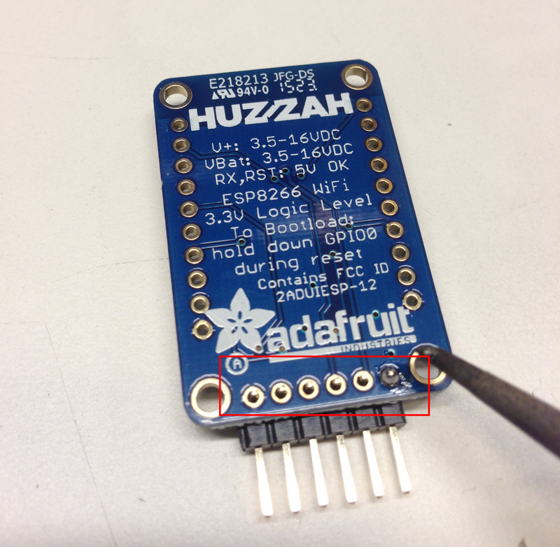 Attach the Huzzah to your computer using an FTDI cable, making sure to plug it in the right way. When you're ready to upload the code, put the Huzzah module into bootloader mode. You'll have to do this before each upload. There is no timeout for bootload mode, so you don't have to rush!