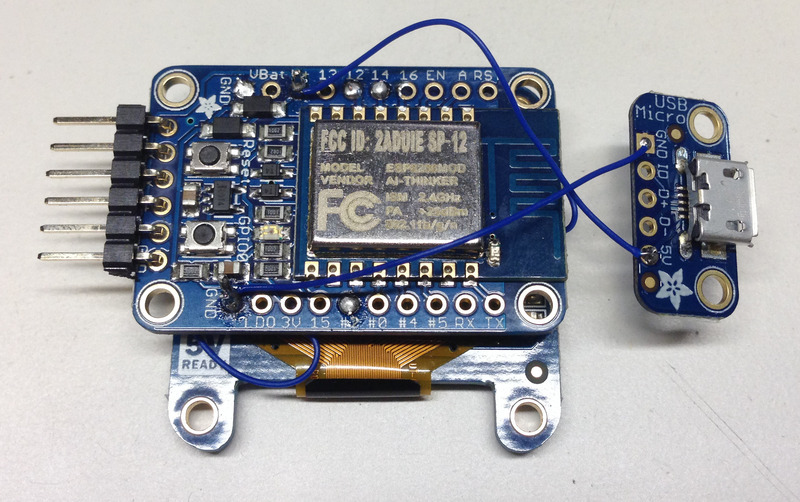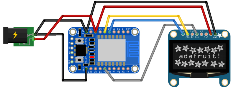 Now make the other connections between the Huzzah and OLED breakout board following the schematic below using thin wire. Remember, ultimately you'll use the header pin soldered into the OLED breakout to make the 5V power connection between the two boards.