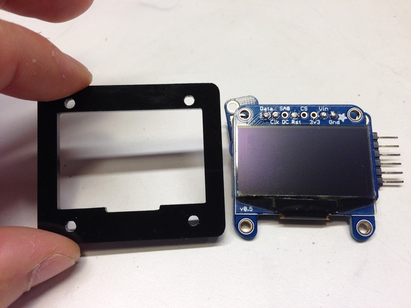 Start by removing the protective sticker from the OLED breakout. Place it into the laser-cut acrylic piece with the corresponding hole or window. Notice the small notch which corresponds to the OLED ribbon connector. It can help at this point to remove the double-stick tape affixing the OLED to the breakout PCB in order to get things lined up well.