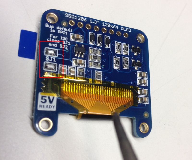On the OLED breakout, solder the two solder jumper pads SJ1 and SJ2 so that you can use the I2C protocol. Do this before soldering the boards together!
