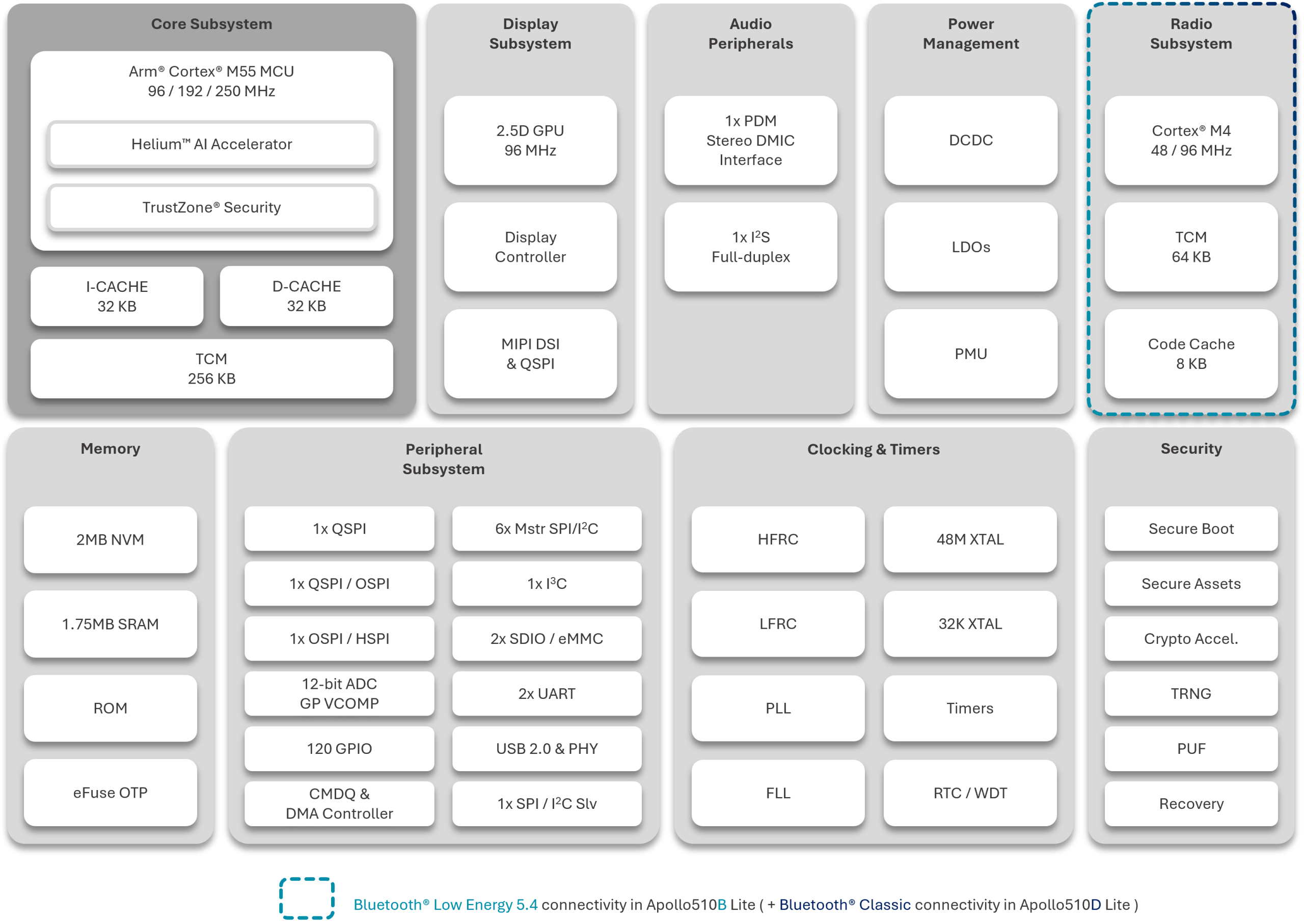 - Dual-mode Bluetooth support: BLE 5.4 (Apollo510B Lite) and Bluetooth Classic + BLE 5.4 (Apollo510D Lite) with RF sensitivity to -104 dBm and up to +14 dBm Tx output power