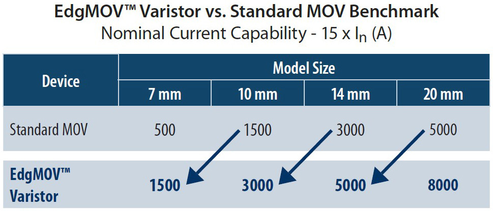 Bourns’ EV series EdgMOV high surge disc varistors allow for the replacement of standard conventional MOV devices with one form factor smaller varistors. These varistors provide superior nominal surge ratings of 1.5 kA, 3 kA, 5 kA, and 8 kA for model sizes 7 mm, 10 mm, 14 mm, and 20 mm. The EV series features increased surge capability in a smaller form factor, allowing more compact board designs for LED lighting, smart meters, fire alarm systems, and motor drive applications.