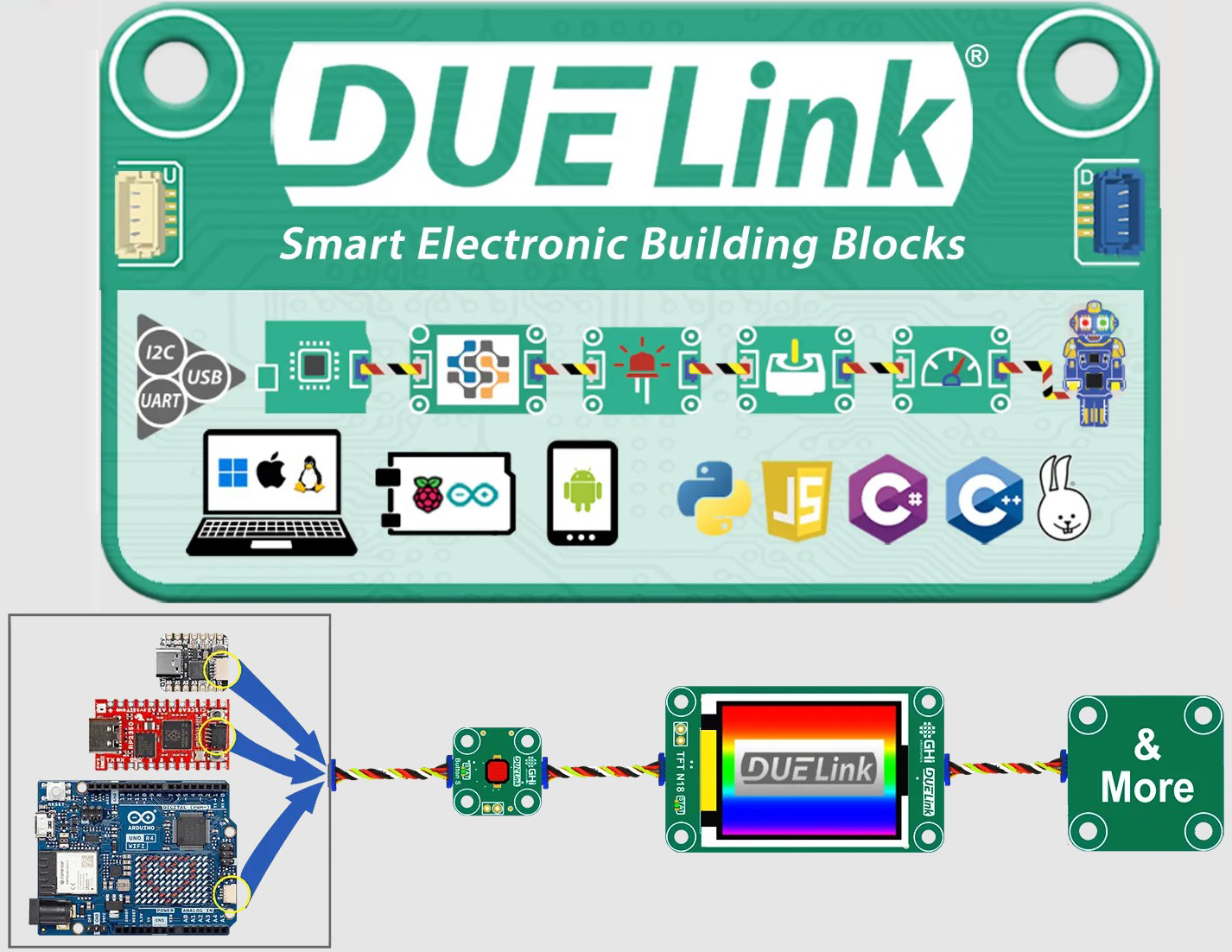 - Cross-ecosystem integration: Works with non-DUELink modules out of the box, including SparkFun Qwiic, Adafruit STEMMA QT, and Arduino Modulino via I2C JST connectors